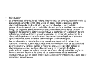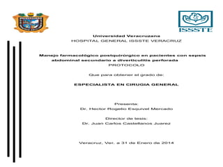 El documento presenta un protocolo para el manejo farmacológico postquirúrgico en pacientes con sepsis abdominal secundaria a diverticulitis perforada. Resalta la importancia del tratamiento con tigeciclina y metronidazol como opciones de manejo postquirúrgico, destacando sus beneficios en comparación con otros esquemas. El objetivo final es establecer un manejo farmacológico efectivo para mejorar los resultados en pacientes afectados.