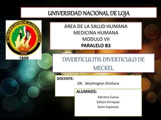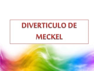 Este documento describe la diverticulitis y los divertículos de Meckel. Define la terminología, incidencia, etiología, manifestaciones clínicas, complicaciones, estudios diagnósticos y tratamiento de la diverticulitis no complicada y complicada, incluidos los abscesos y fístulas. También cubre la epidemiología, patogenia y localización común de los divertículos del colon.