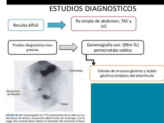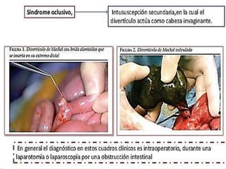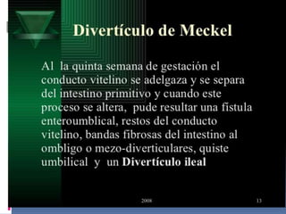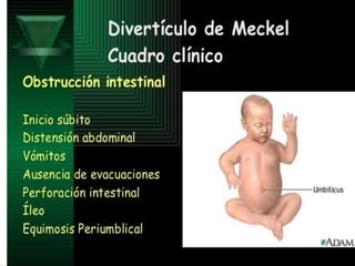 El divertículo de Meckel es una malformación asociada con el conducto onfalomesentérico que representa el 97% de estas anomalías. Se presenta como una obstrucción intestinal, hemorragia digestiva baja u otras complicaciones en niños pequeños. El diagnóstico se basa en los síntomas y el tratamiento es la resección quirúrgica del divertículo.