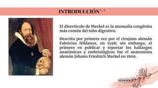 El divertículo de Meckel es la anomalía congénita más común del tubo digestivo, resulta de la obliteración incompleta del conducto onfalomesentérico durante el desarrollo embrionario. Se localiza a 60 cm de la válvula ileocecal y puede contener tejido ectópico como gástrico o pancreático. Las complicaciones más frecuentes son hemorragia e obstrucción intestinal, especialmente en niños menores de 2 años. El diagnóstico se realiza con estudios de imagen como ultrasonido o gammagrafía con te