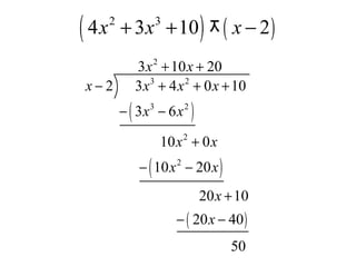 Este documento describe métodos para dividir polinomios, incluyendo división larga, división sintética y sustitución sintética. Explica cómo utilizar división sintética para dividir polinomios y binomios lineales, y cómo aplicar el teorema del residuo. También proporciona ejemplos de cómo usar sustitución sintética para evaluar polinomios para valores dados.