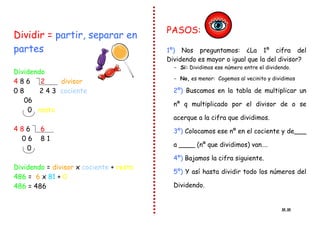 El documento explica los pasos para dividir números enteros en 5 pasos: 1) Determinar si la primera cifra del dividendo es mayor o igual que el divisor, 2) Buscar en la tabla de multiplicar un número que multiplicado por el divisor se acerque a la cifra a dividir, 3) Colocar ese número en el cociente, 4) Bajar la siguiente cifra del dividendo, 5) Repetir los pasos hasta dividir todo el dividendo.