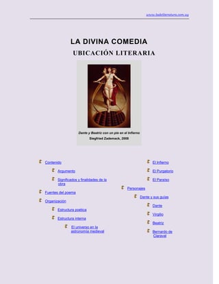 La Divina Comedia es un poema alegórico de Dante compuesto por 100 cantos divididos en tres partes: Infierno, Purgatorio y Paraíso. Narra el viaje imaginario de Dante guiado por Virgilio y Beatriz por los tres reinos de ultratumba para purificar su alma. La obra combina significados literales y alegóricos, y busca instruir moralmente a los lectores sobre el pecado y la salvación. Su estructura se basa en números como 1, 3 y 10, que probablemente tenían significados simbólicos para
