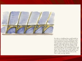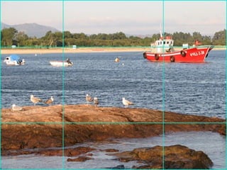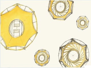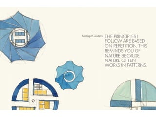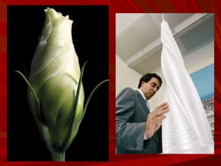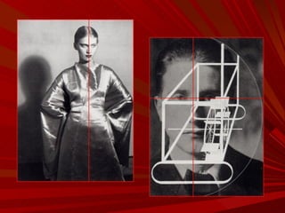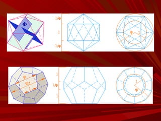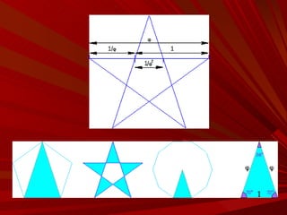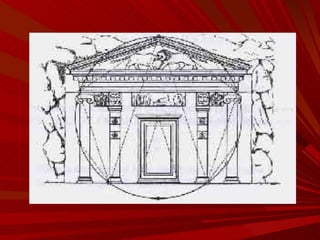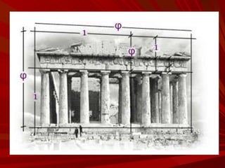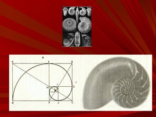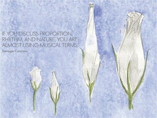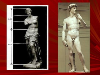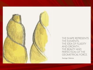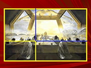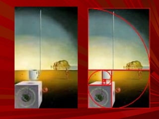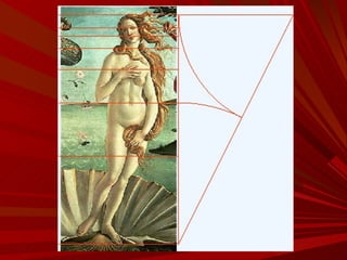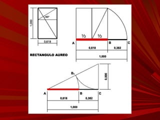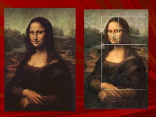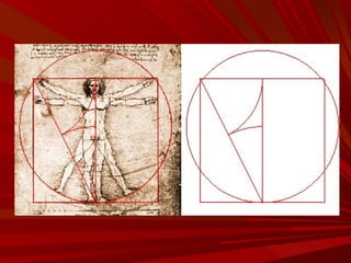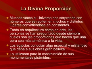 El documento describe la Divina Proporción y cómo se manifiesta en la naturaleza y el arte a través de proporciones como la Sección Áurea y la Secuencia de Fibonacci. Explica que artistas y arquitectos como Leonardo da Vinci y Le Corbusier usaron estas proporciones en sus obras basadas en las medidas del cuerpo humano. También presenta ejemplos de cómo la Divina Proporción se encuentra en las pirámides de Egipto, obras de arte renacentistas y en la arquitectura de Santiago Calatrava.