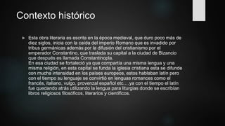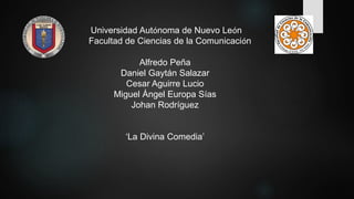 La Divina Comedia es un poema escrito por Dante Alighieri en el siglo XIII que narra el viaje del autor a través del infierno, el purgatorio y el paraíso. Dante es guiado por Virgilio a través del infierno y el purgatorio hasta que Beatriz lo guía al paraíso. La obra utiliza símbolos y personajes históricos y mitológicos para representar la tentación del pecado, la razón humana y el conocimiento divino. Se considera la obra maestra de la literatura medieval y una representación
