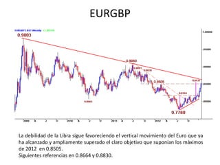 El documento resume el movimiento reciente del Euro frente a otras monedas como la libra y el yen. El Euro ha alcanzado nuevos máximos frente a la libra y el yen, superando niveles de resistencia clave de 2012 y 2011, respectivamente. El movimiento alcista actual del Euro podría continuar proyectándose hacia objetivos más altos de 1.40-1.42 frente al dólar y 0.8664 y 0.8830 frente a la libra, aunque la fuerte pendiente del impulso actual eventualmente podría pesar sobre la tendencia alcista general.