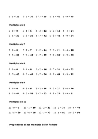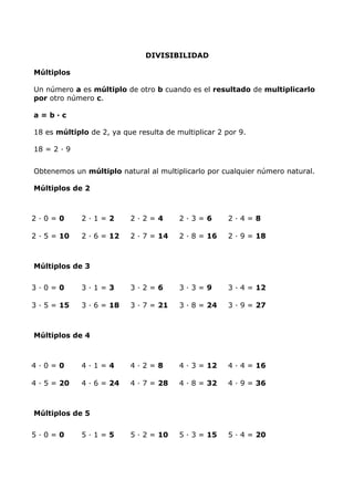 Este documento explica conceptos matemáticos como múltiplos, divisores, números primos, números compuestos y cómo descomponer números en factores primos. Define múltiplos como el resultado de multiplicar un número por otro natural. Explica cómo encontrar los divisores de un número y cómo descomponer números en factores primos usando divisiones sucesivas. También presenta criterios para determinar la divisibilidad de un número y define el máximo común divisor.