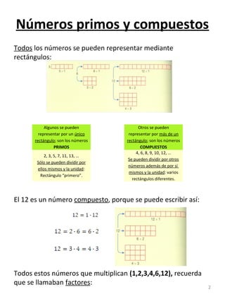 Este documento presenta conceptos básicos sobre divisibilidad de números. Explica que los números pueden ser primos o compuestos, y cómo calcular múltiplos, divisores, el máximo común divisor y el mínimo común múltiplo de números. También describe la descomposición factorial para encontrar todos los divisores de un número.