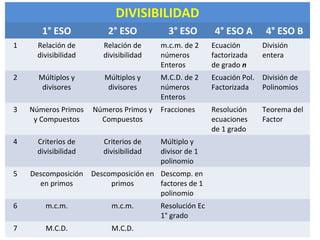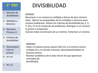 Este documento presenta los conceptos fundamentales de la divisibilidad en matemáticas. Explica la relación de divisibilidad, los múltiplos y divisores, los números primos y compuestos, los criterios de divisibilidad, la descomposición en factores primos, el mínimo común múltiplo y el máximo común divisor. El objetivo es que los estudiantes comprendan y apliquen estas nociones básicas de la divisibilidad para resolver problemas.