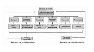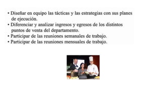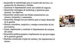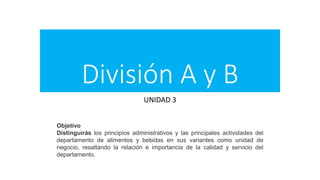 Este documento describe la unidad 3 de un curso sobre el departamento de alimentos y bebidas en la industria hotelera. Explica la estructura típica de los departamentos en un hotel, incluyendo house keeping, front office, administración, recursos humanos, marketing y ventas, compras y mantenimiento. Luego se enfoca en el departamento de alimentos y bebidas, describiendo sus divisiones como restaurantes, bares, cafeterías, room service, banquetes y catering. Finalmente, detalla los conceptos de gestión, centros de apoyo y producción