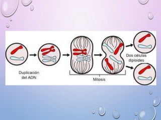 La división celular incluye la mitosis y la meiosis. La mitosis es el proceso por el cual las células se dividen en dos células hijas idénticas genéticamente. Consta de cuatro fases: profase, metafase, anafase y telofase. La meiosis produce gametos con la mitad de cromosomas y permite la reproducción sexual a través de la recombinación genética. Incluye dos divisiones celulares que reducen el número de cromosomas a la mitad y producen cuatro células hijas genéticamente únic