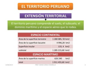 Este documento presenta información sobre la división política del Perú impartida por el profesor Mario Jorge Chambilla. Explica que el Perú está dividido en 26 regiones, 195 provincias y 1832 distritos. Además, proporciona detalles sobre el proceso de regionalización de 1988 y 2002 y un mapa que muestra la actual organización político-administrativa del país.