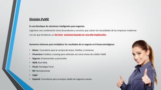 División Pyme ofrece soluciones inteligentes para negocios a través de una amplia gama de servicios en ocho áreas estratégicas, incluyendo consultoría sobre vehículos, financiamiento, seguros, y marketing digital. Se enfoca en entender las necesidades de sus clientes para brindar un servicio personalizado y eficiente, facilitando la compra de vehículos y optimizando el crecimiento empresarial. Desde 2008, su misión ha sido innovar en la forma de hacer negocios, adaptándose a los cambios y demandas del mercado.