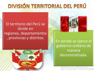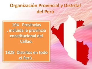 El territorio de Perú se divide en regiones, departamentos, provincias y distritos, donde el gobierno ejerce un gobierno unitario de manera descentralizada. La provincia constitucional de Callao tiene seis distritos: Bellavista, La Perla, Carmen de la Legua, Callao (cercado), Ventanilla y La Punta.