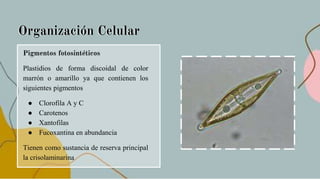 Las diatomeas pertenecen a la división Bacillariophyta. Tienen plastidios discoidales de color marrón o amarillo que contienen pigmentos como clorofila, carotenos y xantofilas. Su pared celular llamada frústula está compuesta de sílice y presenta ornamentaciones como areolas y estrías. Se reproducen tanto asexual como sexualmente. Habitan en ambientes acuáticos dulces y marinos, donde desempeñan un importante papel ecológico como indicadoras de la calidad del agua y