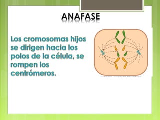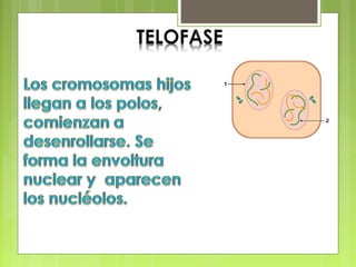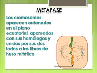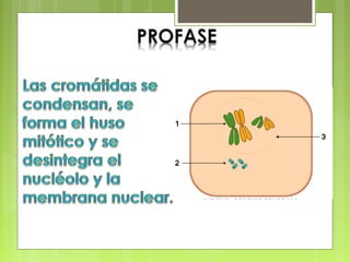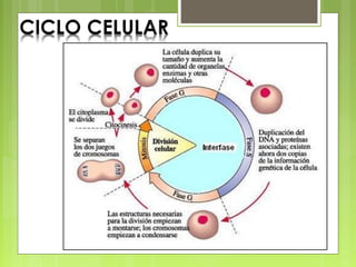 El documento describe el ciclo celular y la replicación del ADN. Explica que las células somáticas son diploides con 46 cromosomas, mientras que las células sexuales son haploides con 23 cromosomas. Detalla las fases del ciclo celular (G1, S, G2) y cómo ocurre la replicación del ADN durante la fase S, duplicándose la información genética. También compara las fases de la meiosis I y II que reducen el número de cromosomas a la mitad para formar gametos.