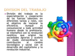 La división del trabajo se ha intensificado a lo largo de la historia humana para mejorar la eficiencia, especialmente con el desarrollo del capitalismo y la revolución industrial. Existen diferentes tipos de división del trabajo como la división industrial, vertical y colateral. El taylorismo se basa en la división entre dirección y trabajadores y la simplificación de tareas, mientras que el fordismo promueve la especialización y reducción de costos a través de la expansión del mercado. El toyotismo se distingue por su énfasis en el trabajo flexible y la product