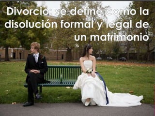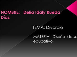 El documento habla sobre el divorcio y el diseño de un programa educativo para ayudar a las personas que están pasando por un divorcio. Brevemente menciona algunas posibles causas de divorcio y pide más información sobre el tema.