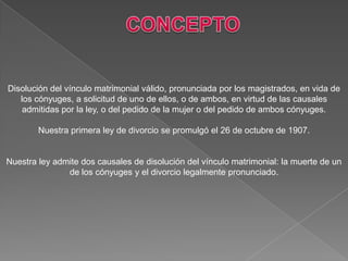 La ley de divorcio se promulgó en 1907 y permite el divorcio por causal o mutuo consentimiento. Reconoce diez causales como adulterio, intento de asesinato, maltrato, abandono del hogar por más de tres años, o separación de hecho por más de tres años. El divorcio requiere audiencias de conciliación y puede demorar hasta un año en completarse.