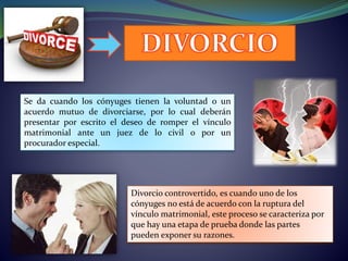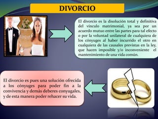 El divorcio disuelve legalmente el vínculo matrimonial ya sea por acuerdo mutuo de las partes o por la voluntad unilateral de uno de los cónyuges cuando el otro ha incurrido en causales previstas por la ley que hacen imposible mantener la vida en común. El divorcio ofrece a los cónyuges poner fin a la convivencia y deberes matrimoniales para poder rehacer sus vidas de forma independiente. Existen divorcios de común acuerdo cuando ambas partes desean disolver el matrimonio, y divorcios