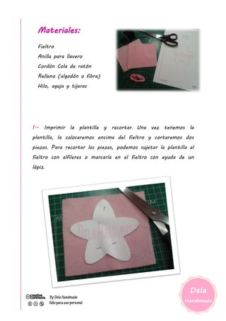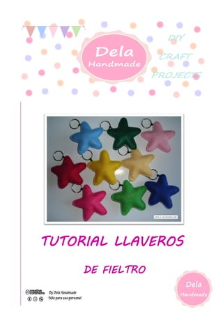 El documento es un tutorial para crear llaveros de fieltro, detallando los materiales necesarios como fieltro, anillas, cordón, y herramientas de costura. Describe el proceso en cinco pasos, desde imprimir y recortar la plantilla, unir las piezas, añadir el cordón y el relleno, hasta cerrar el llavero. Este proyecto es ideal para quienes buscan realizar manualidades sencillas con fieltro.