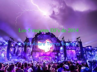 El documento habla sobre los mejores 5 DJs de 2014 según un ranking internacional. En el primer puesto se encuentra Hardwell, un DJ holandés conocido por canciones como Spaceman. En segundo lugar están Dimitri Vegas & Like Mike, DJs belgas que recientemente se han abierto paso entre los mejores. El tercer puesto lo ocupa Armin Van Buuren, un DJ y productor de trance holandés galardonado varias veces como el mejor del mundo. En cuarto lugar se ubica Martin Garrix, un joven holandés de 17 años que impresionó con