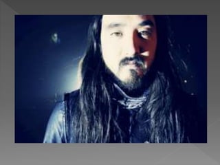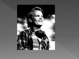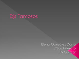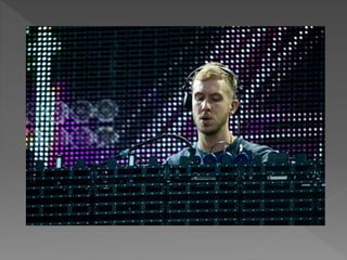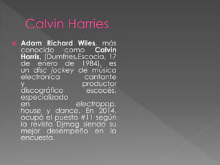 El documento describe brevemente a cuatro DJs y productores musicales: Calvin Harris de Escocia, Avicii de Suecia, Steve Aoki de Estados Unidos y Afrojack de los Países Bajos. Proporciona información básica sobre cada uno como su lugar de nacimiento, géneros musicales y logros profesionales.