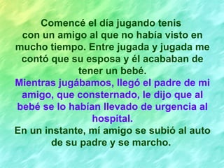 El autor relata una experiencia que tuvo con un amigo cuando su bebé fue llevado de urgencia al hospital. Aunque se sintió inútil al principio, decidió acompañar a su amigo al hospital y entregarle las llaves de su auto. Allí brindó su apoyo moral mientras su amigo y su esposa pasaban por el dolor de perder a su recién nacido. Esta experiencia le enseñó que lo más importante es estar presente para los demás en los momentos difíciles, y que la vida puede cambiar en un instante.
