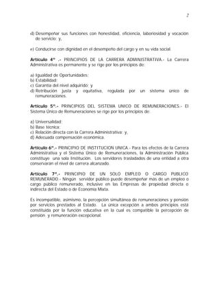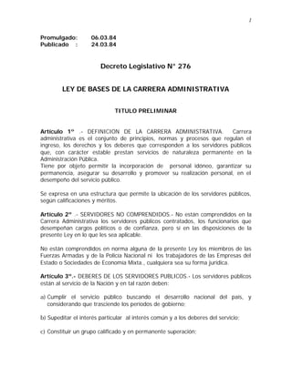 Este documento presenta la Ley de Bases de la Carrera Administrativa de Perú. Establece los principios y estructura de la carrera administrativa, incluyendo grupos ocupacionales, niveles, ingreso, ascenso, obligaciones, prohibiciones y derechos de los servidores públicos. También describe el régimen disciplinario y las posibles sanciones por faltas cometidas por los servidores en el ejercicio de sus funciones.