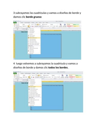 Este documento presenta los pasos para crear una tabla de multiplicar en una hoja de cálculo. Inicia seleccionando todas las celdas y agregando color y logo. Luego escribe números del 1 al 20 y alarga las celdas. Subraya las cuadriculas y agrega borde grueso y borde en todos los lados. Escribe la fórmula =K16*L16 con signo $ para multiplicar la fila y repite hasta completar la tabla.