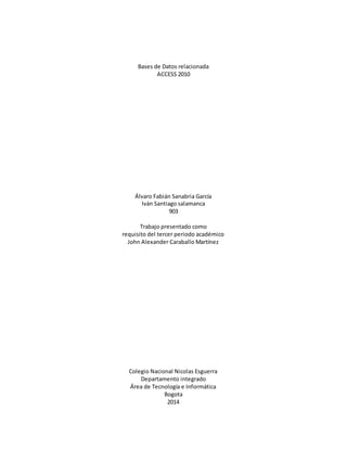 Este documento proporciona información sobre bases de datos relacionales en Microsoft Access 2010. Explica conceptos básicos como tablas, campos, tipos de datos e ilustra los pasos para crear una base de datos para una empresa ficticia con una tabla de clientes. También define formularios e incluye un mapa conceptual sobre Access. El objetivo es comprender los componentes básicos de una base de datos y cómo crear una en Access.