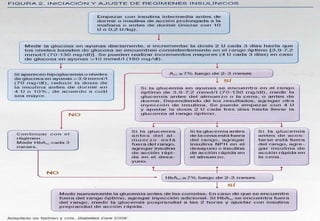 Los tres documentos tratan sobre diabetes mellitus. El primero describe factores de riesgo y exámenes de pacientes para detectar la diabetes. El segundo explica los tipos de diabetes, factores de riesgo, características y criterios de diagnóstico. El tercero discute el manejo y control de la diabetes mellitus tipo 2, incluyendo objetivos de tratamiento, estilos de vida saludables y progresión del tratamiento.