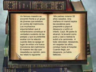 El maestro le cuenta a un grupo de jóvenes que estaban en contra del matrimonio la historia de sus padres que estuvieron casados por 55 años. Cuando la madre de el maestro muere repentinamente, su padre condujo rápidamente al hospital pero ya había fallecido. En el funeral y después, el padre expresó el gran amor que sintió por su esposa a través de los años que compartieron juntos, incluyendo momentos difíciles y de alegría. El padre dijo que esos 55 años de matrimonio fueron buenos y que está content