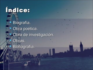 Dámaso Alonso fue un poeta y filólogo español perteneciente a la Generación del 27. Publicó varios libros de poesía que evolucionaron desde un estilo puro influenciado por Juan Ramón Jiménez hasta una poesía más existencialista. También se destacó por su obra de investigación sobre poetas clásicos españoles como Góngora y San Juan de la Cruz. Fue director de la Real Academia Española.