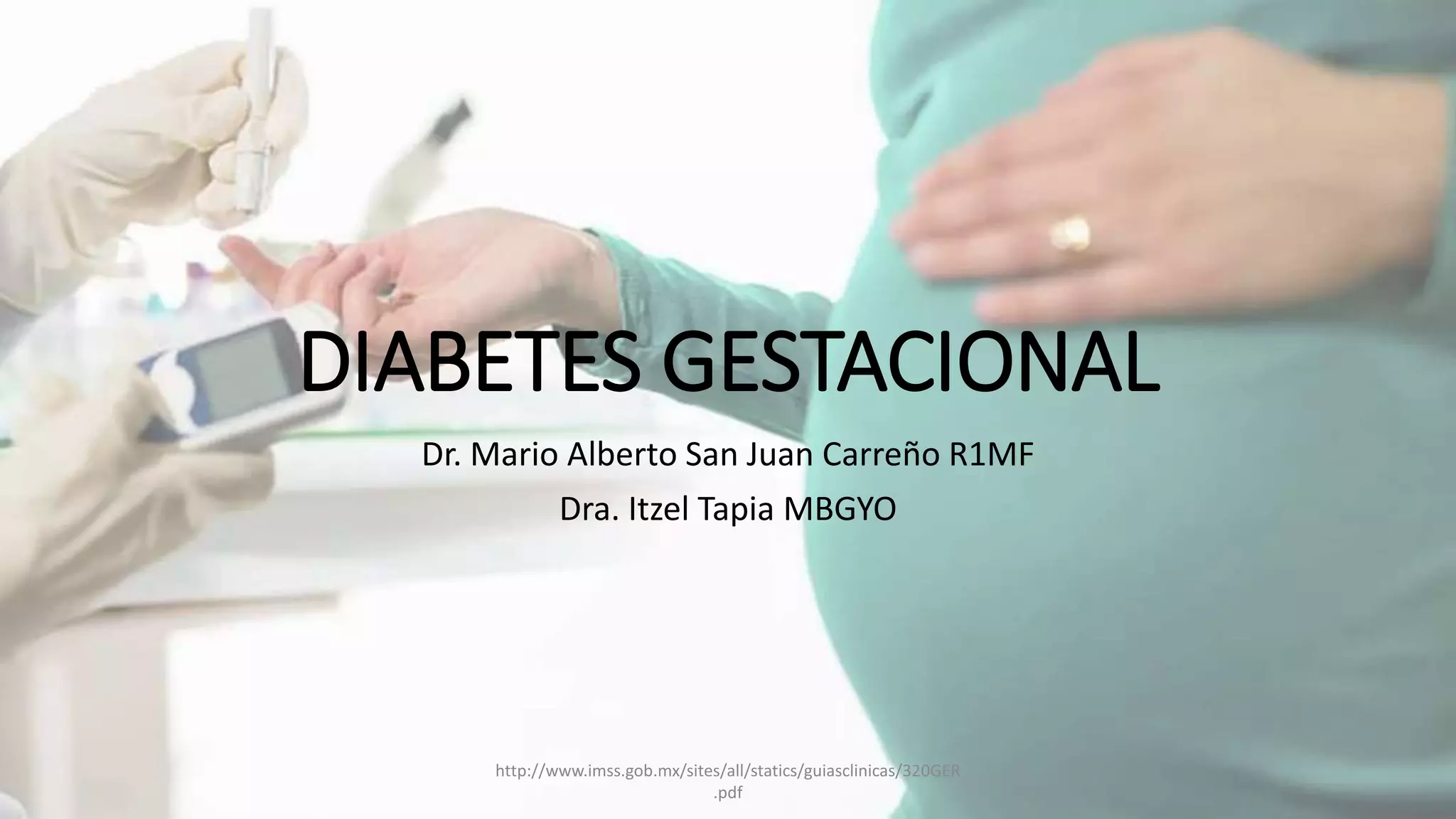 Este documento describe la diabetes gestacional, incluyendo sus objetivos de diagnosticarla y establecer metas terapéuticas durante el embarazo. Explica que la diabetes gestacional es una intolerancia a los carbohidratos que se diagnostica durante el embarazo y puede o no resolverse después. Detalla los criterios para diagnosticarla, incluyendo pruebas de glucosa, así como las metas de tratamiento con metformina o insulina.
