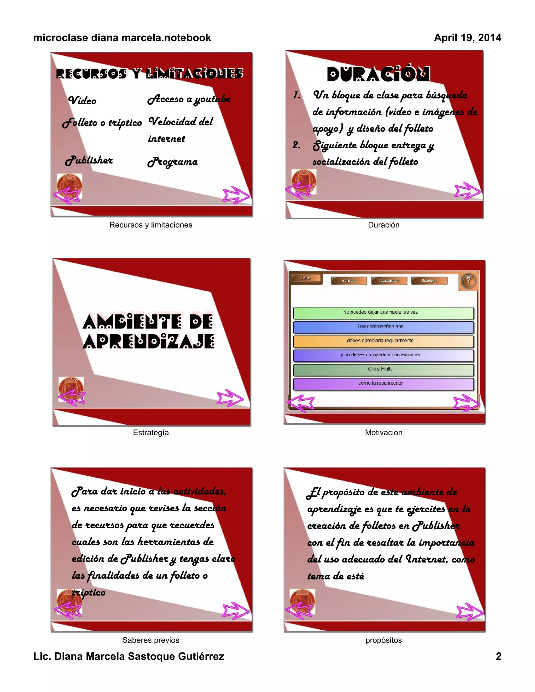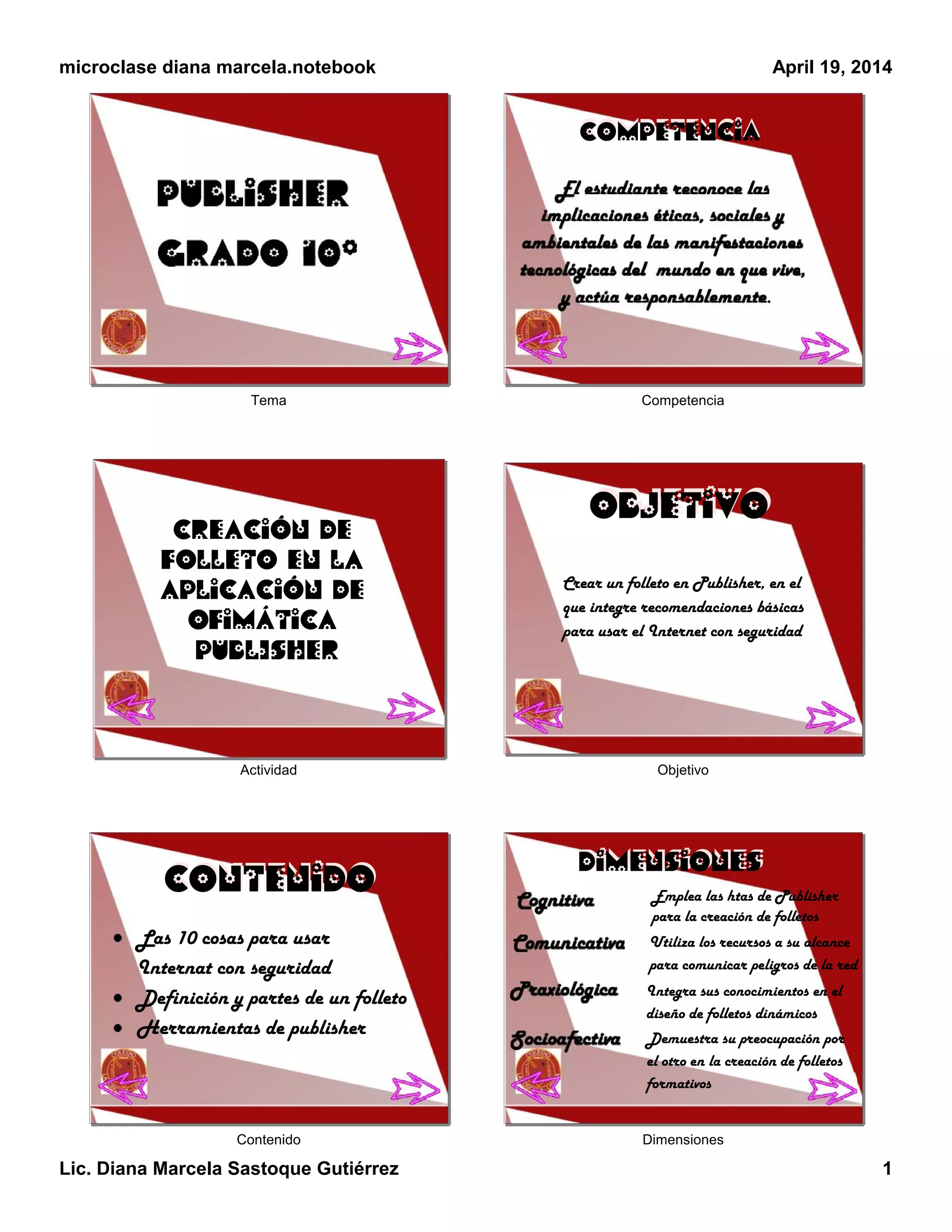 Este documento presenta una actividad para crear un folleto en Microsoft Publisher sobre cómo usar Internet de manera segura. El objetivo es que los estudiantes aprendan a utilizar las herramientas de Publisher para diseñar folletos dinámicos e informativos que comuniquen los peligros de la red. La actividad se desarrollará en dos bloques, uno para buscar información y diseñar el folleto, y otro para entregar y socializar los resultados. Los estudiantes serán evaluados en base a criterios como el uso adecuado de Publisher y la incl