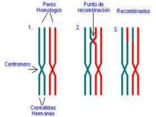 El documento presenta información sobre la recombinación genética. Se produce durante la meiosis y causa el intercambio de segmentos entre dos dobles helices de ADN. Esto contribuye a la variabilidad genética en organismos con reproducción sexuada al distribuir los genes en las partes intercambiadas. Requiere energía provista por ATP y proteínas como Rad51 para ocurrir.