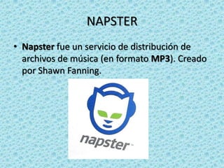 Napster fue un servicio pionero de intercambio de archivos MP3 creado en 1999 por Shawn Fanning que permitía a los usuarios compartir música de forma gratuita. Recibió demandas por violaciones de derechos de autor y finalmente cerró en 2001, aunque la marca fue adquirida posteriormente.