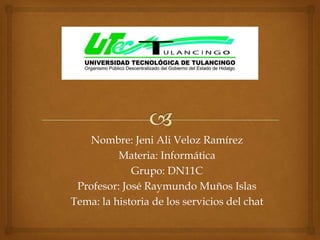 Este documento resume la historia de los servicios de chat, incluyendo que IRC permitió conversaciones de grupo entre usuarios sin conexión previa a través de canales, fue creado en 1988, y ganó popularidad durante eventos de censura mediática, aunque su uso ha disminuido con el ascenso de la mensajería instantánea y redes sociales.