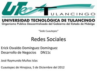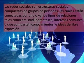 Este documento habla sobre las redes sociales. Define las redes sociales como estructuras sociales compuestas de grupos de personas conectadas por relaciones como amistad, familia o intereses comunes. Explica que el análisis de redes sociales estudia estas estructuras aplicando la teoría de grafos para identificar nodos y enlaces. También menciona que las redes sociales en internet facilitan la comunicación y comparten información.