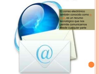 El documento describe la historia del correo electrónico. Explica que el correo electrónico nos permite comunicarnos desde cualquier lugar gracias a Internet y las nuevas tecnologías. En 1971, Ray Tomlinson envió el primer correo electrónico a sí mismo, usando el símbolo @ para especificar el destinatario, dando inicio a la era del correo electrónico.