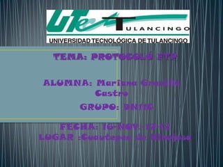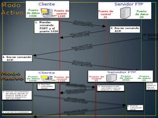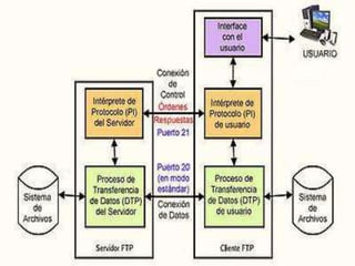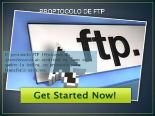 El protocolo FTP permite transferir archivos entre equipos a través de una red TCP/IP de manera eficiente. Define la manera en que los datos deben ser transferidos y permite que sistemas remotos compartan archivos independientemente de sus sistemas de archivos. Usa dos tipos de transferencia: ASCII para archivos de texto e imágenes y binario para otros como ejecutables y archivos comprimidos.