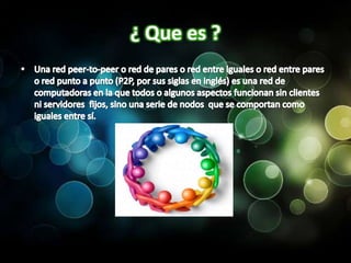 Una red peer-to-peer (P2P) es una red de computadoras en la que los nodos funcionan como iguales sin clientes o servidores fijos, permitiendo el intercambio directo de información entre ordenadores conectados. Las redes P2P aprovechan el ancho de banda de los usuarios para obtener un rendimiento mayor que los métodos centralizados convencionales. Algunas aplicaciones de las redes P2P incluyen el intercambio de archivos, sistemas de archivos distribuidos, telefonía por Internet y pruebas para
