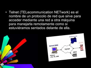 Telnet es un protocolo de red que permite el acceso remoto y la administración de otra máquina a través de una red como si se estuviera físicamente delante de ella, aunque sólo funciona en modo terminal sin gráficos. Aunque fue una herramienta útil para solucionar problemas de forma remota, su mayor problema es la falta de seguridad ya que los nombres de usuario y contraseñas viajan por la red sin cifrado.