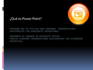 Power Point es un programa de Microsoft Office que permite crear presentaciones electrónicas profesionales con diapositivas que incluyen texto, gráficos, videos e imágenes. Las presentaciones pueden utilizarse para informar, persuadir, entretener y educar audiencias, así como para motivar o vender ideas y productos. Power Point ofrece ventajas como la creación y edición sencilla de diapositivas y la posibilidad de agregar sonidos, animaciones y contenido de otros programas de Office.