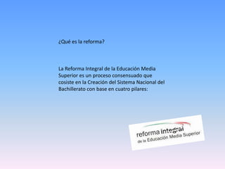 La Reforma Integral de la Educación Media Superior es un proceso consensuado que consiste en la creación de un Sistema Nacional del Bachillerato con cuatro pilares: un Marco Curricular Común, definición de modalidades de oferta educativa, profesionalización de servicios educativos y certificación nacional complementaria. La reforma involucra a todos los subsistemas educativos para dotar a estudiantes, docentes y comunidad de fundamentos teórico-prácticos y hacer relevante la educación media superior. Con la reforma, los programas y planes de est