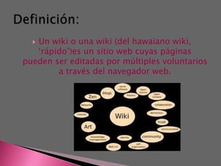 Un wiki es un sitio web cuyas páginas pueden ser editadas por múltiples usuarios a través de un navegador web, permitiendo que los usuarios creen, modifiquen o borren texto compartido. Las páginas wiki tienen títulos únicos y los títulos se convierten en enlaces cuando se escriben entre corchetes. Wikis son comúnmente usados para crear enciclopedias colaborativas como Wikipedia, y la mayoría conservan un historial de cambios que facilita el mantenimiento conjunto.
