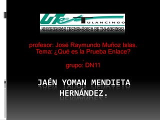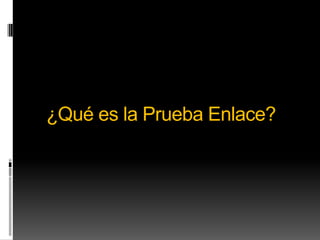 La Prueba Enlace es un examen anual aplicado a todas las escuelas públicas y privadas de nivel básico en México por la Secretaría de Educación Pública para medir el desempeño de los estudiantes en español y matemáticas. Tiene como objetivo promover la transparencia y rendición de cuentas en el sistema educativo y proveer información que pueda usarse para mejorar la educación a través de programas de tutoría y formación de maestros.