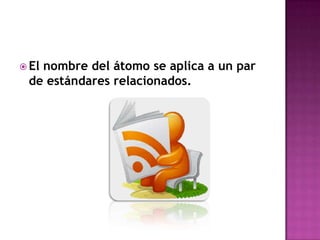 ATOM es un formato XML para sindicación web y enlaces. Consiste en estándares para sindicación de contenido y un protocolo HTTP para crear y actualizar recursos en la web de forma simple. Fue desarrollado como alternativa a RSS.