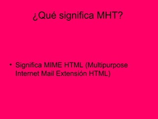 MHT o HTML significa MIME HTML, que es un estándar para incluir recursos como imágenes y hojas de estilo en páginas web al codificarlos y guardarlos junto con el código HTML en un solo archivo. Aunque el formato MHT permite guardar páginas web con todos sus recursos, el proceso de guardado no está completamente estandarizado y el archivo resultante puede verse de forma diferente en diferentes navegadores.